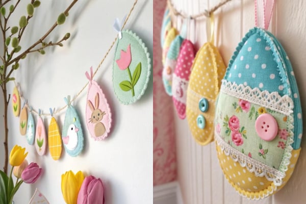Nagyon mutatós a tojás alakú girland: vágj ki több tojásformát színes vászonból, varrd össze őket varrógéppel, párosával, majd fűzd fel egy madzagra. Egy kis hímzés, gomb vagy szalag még vidámabbá teszi.
