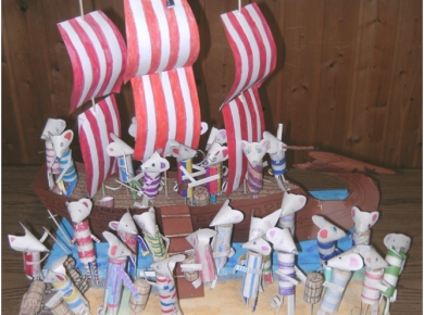 A Szélkirálynő kartonból, hungarocellből és parafalapból készült, az árboc hurkapálcából, a tenger és a part festett papírral borított hungarocellből.